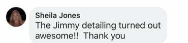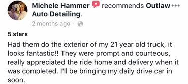 Exterior Detail – Hand wash, hand clay bar (removes oxidation which makes paint rough), wax application, sealant application (protects for 6 months), detail wheels, shine tires, wash windows.