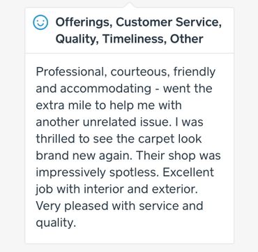Carpet and/or cloth seats cleaned, steamed and extracted to remove stains, odors and more.